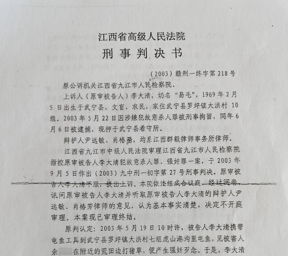 当年案发不久,李大清被九江市中级人民法院判处死刑。李大清不服判决上诉后,江西省高级人民法院改判死缓。李大清及家人不断申诉,但申诉均被江西省高级人民法院驳回。