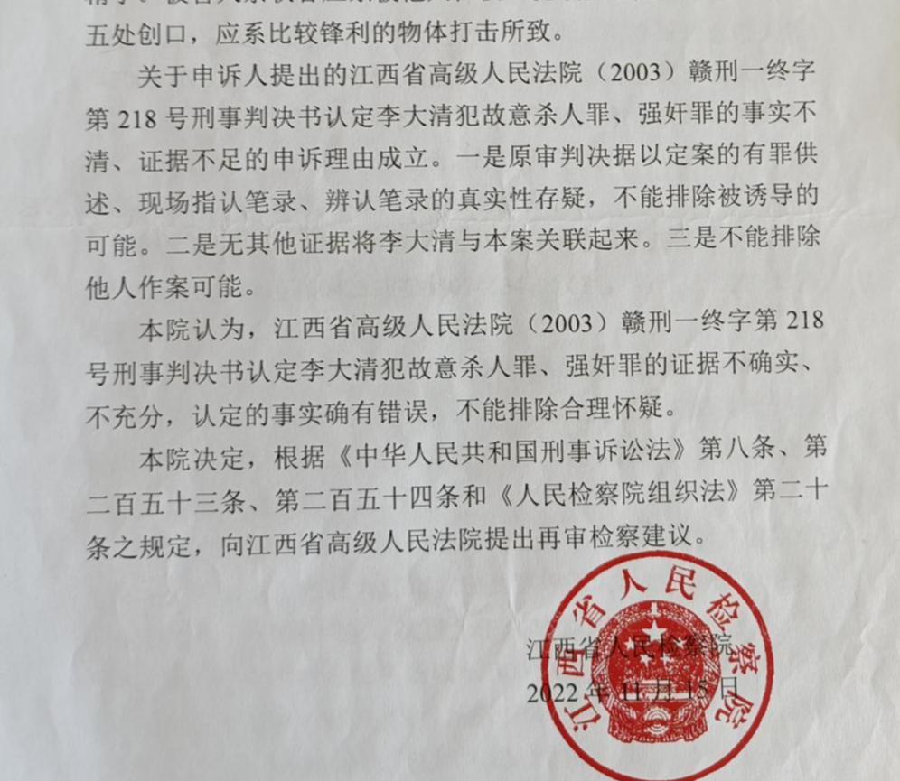 李大清出狱9个多月后,收到江西省人民检察院出具的《刑事申诉结果通知书》:江西省高级人民法院认定李大清犯故意杀人罪、强奸罪的证据不确实、不充分,认定的事实确有错误,不能排除合理怀疑。