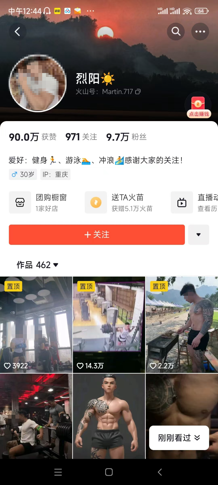 健身网红“烈阳”喜欢健身、游泳、冲浪。/抖音截图
