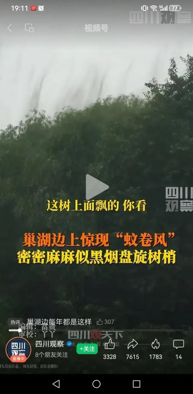 黑色的“浓烟”其实就是摇蚊,它是一种小飞虫,常年以数以亿计的数量在巢湖一带水边生存。摇蚊通常喜欢生活在有湖泊河流的地方,巢湖就成了它们最好的栖息地。大量聚集在一起的时候呈现烟雾状,喜欢在湖边树上附近盘旋。它的嘴(口针)已退化,不具吸食的功能。它们不但不吸血,还是鸟类重要的食物,更是巢湖生态系统循环的重要组成部分。