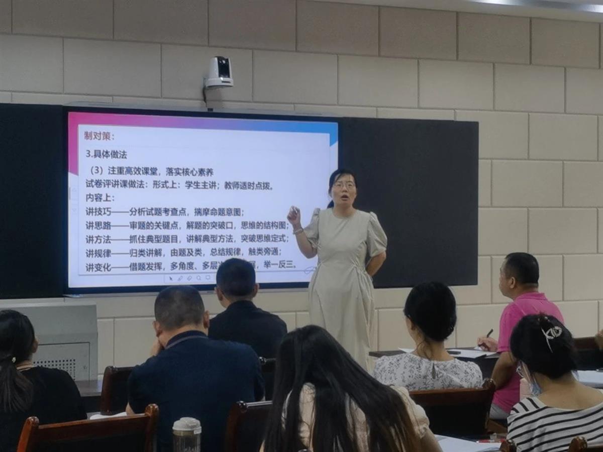 2024届高三数学备课组长陈雪霏老师做了题为《团结务实,科学备考》分享报告。她讲的三年备考的三个关键词是——团结、务实、科学。一、团结。1.目标一致。那就是教育好我们学校的每一位学生。全员德育,德育全员。一方面是将本校学生教育好的需要,另一方面是自己本人能在学生中树立威信,能更有效地教育好学生的需要。2.统一规划。在备课组长组织下做好三年规划,然后在这个长期规划下进行短期规划。统一资料、统一试卷、统一作业、统一要求等,但是这个统一是相对而言,在大统一下根据班情适当调整。3.分工明确。4.相互配合与支持。二、务实。1.把握学情。尤其需要教师了解学生的思维方式,确保教与学不脱节。2.研究考情。确保教与考,学与考不脱节。3.统控全局。确保全班、全年级有较好的数学学习的氛围。4.目标聚焦。研究学生,根据学生学习能力和学习品质确定目标生,培优辅差。三、科学。1.三年备考的一惯性。从高一开始,学法指导,学习习惯培养,思维能力培养,打牢基础。2.教师主导,学生主体,挖掘学生的主观能动性。3.关注学生心理,数学学习兴趣与信心。