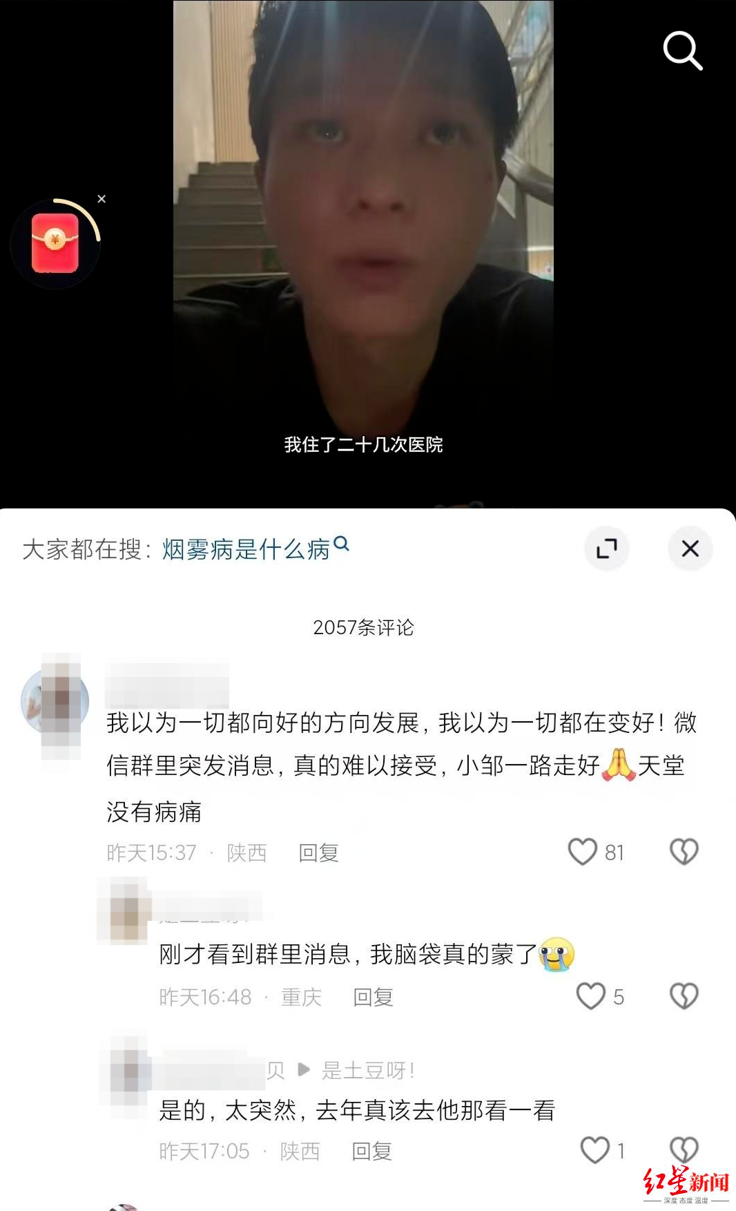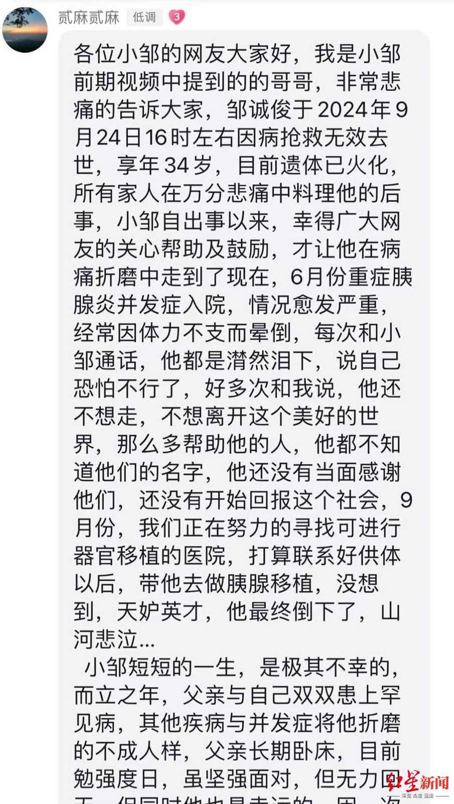 9月25日深夜,红星新闻从其亲友处获知:2024年9月24日,因病抢救无效,34岁的湖北宜昌青年邹诚俊最终还是离开了这个世界。