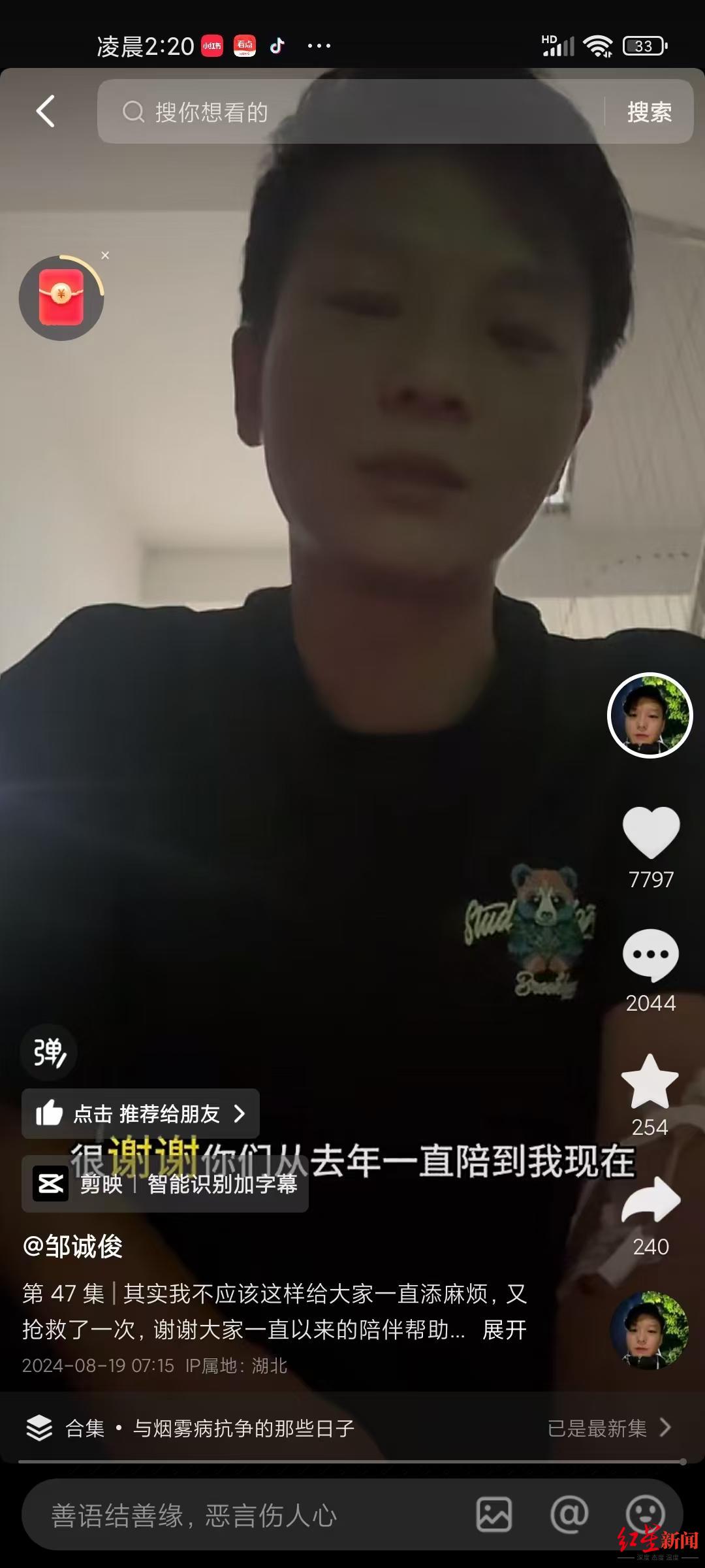 邹诚俊生前发布的最后一个视频是在8月19日。他刚刚经历过一次抢救。