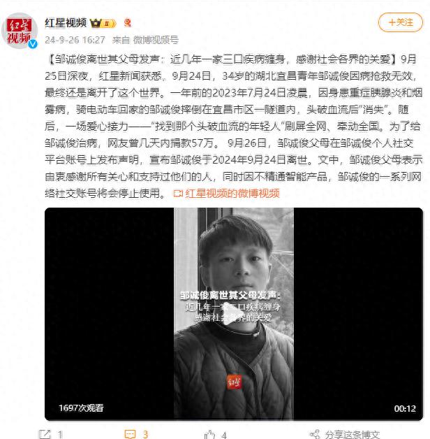 9月26日,邹诚俊父母在邹诚俊个人社交平台账号上发布声明,宣布邹诚俊于2024年9月24日离世。文中,邹诚俊父母表示由衷感谢所有关心和支持过他们的人,同时因不精通智能产品,邹诚俊的一系列网络社交账号将会停止使用。
