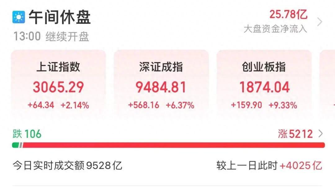 9月27日,A股三大股指高开高走,午后开盘,三大股指继续发力上攻,其中创业板指盘中涨超11%,续创历史盘中最大涨幅。