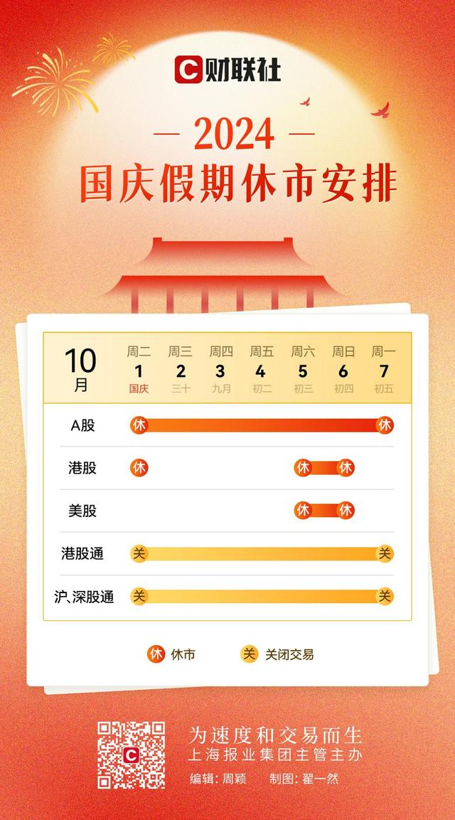 国庆休市日历来了!A股10月1日至10月7日休市,10月8日起照常开市。