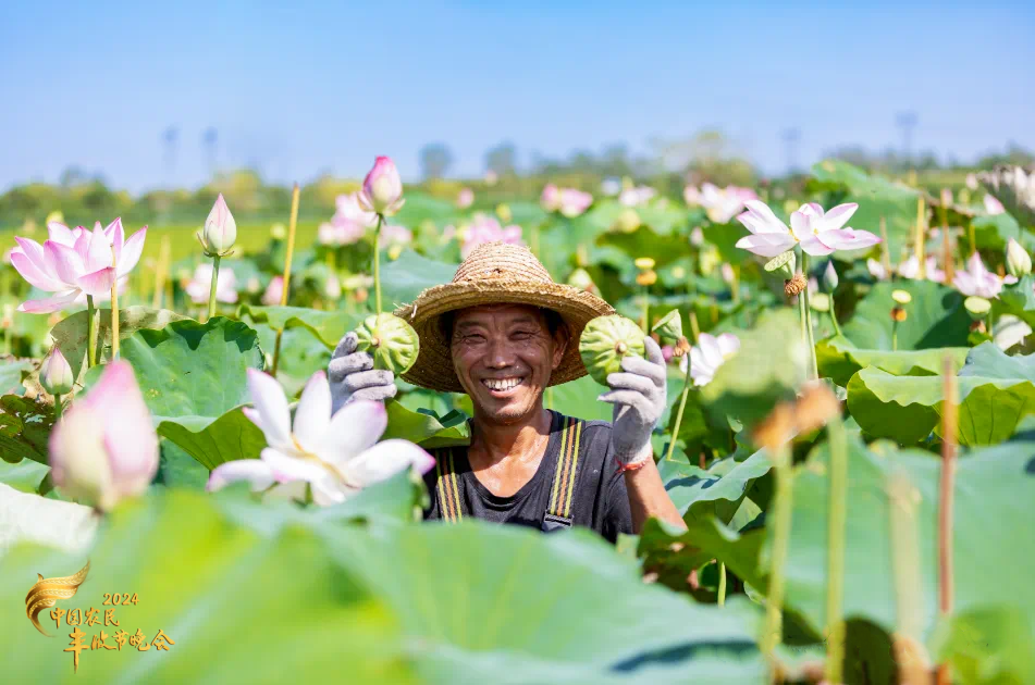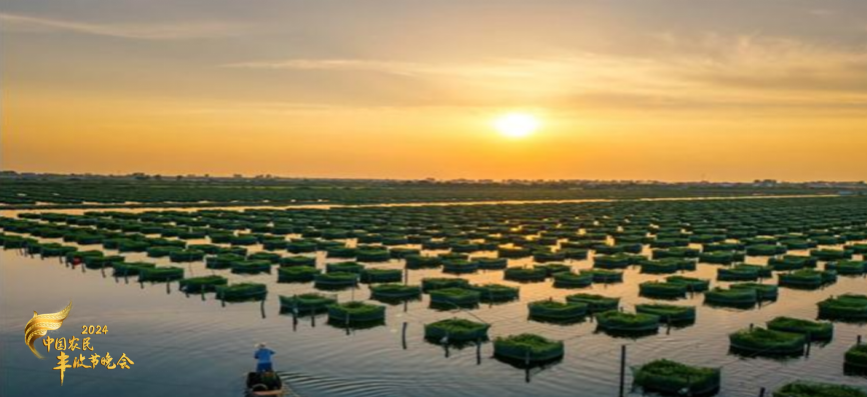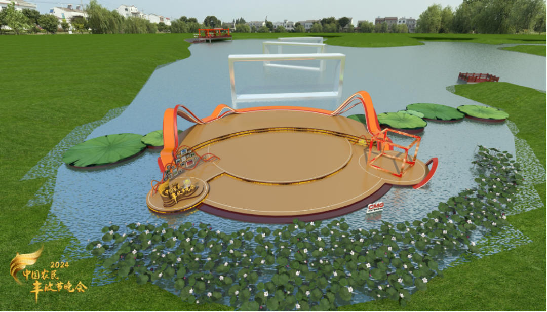“鱼米之乡”庆丰收,“水上舞台”办丰晚。2024年《中国农民丰收节晚会》主舞台设在湖北省仙桃市先锋村,舞台因地制宜,建于村居一畔的水塘之上,两侧以荷叶造型搭起长廊步道,导播台背后是连片的规模化黄鳝养殖水箱,绿水青山就是最好的“舞美”。