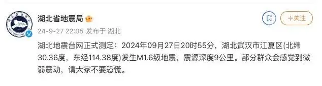 9月27日20时55分,湖北省地震局监测到武汉市江夏区发生了1.6级地震,引发市民关注。