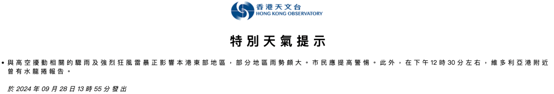 香港天文台表示,9月28日中午12时30分左右,维多利亚港附近曾有水龙卷报告。