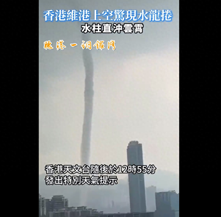 9月28日中午12时半左右,香港维多利亚港上空惊现水龙卷,海水卷成柱状,在半空中转动约2分钟,有众多市民在现场看到“龙吸水”,纷纷拍摄上传至社交媒体。