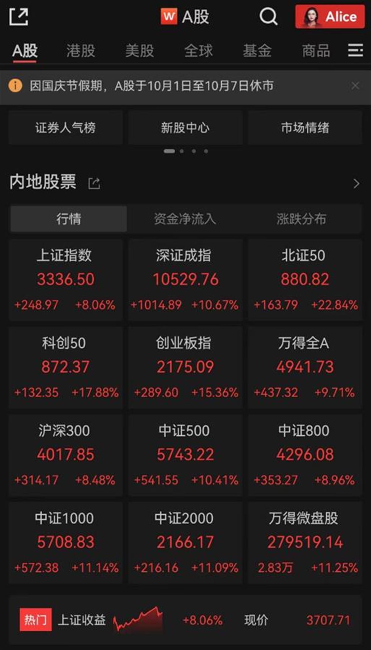 9月30日,大盘在国庆节前最后一日,继续缔造各种历史,沪指涨8%直接收复3300点,创业板指、科创50、北证50同步创下历史最大涨幅。全天非ST个股全线收涨,超3000股涨幅超过9%。A股全天成交2.61万亿元,刷新历史天量。