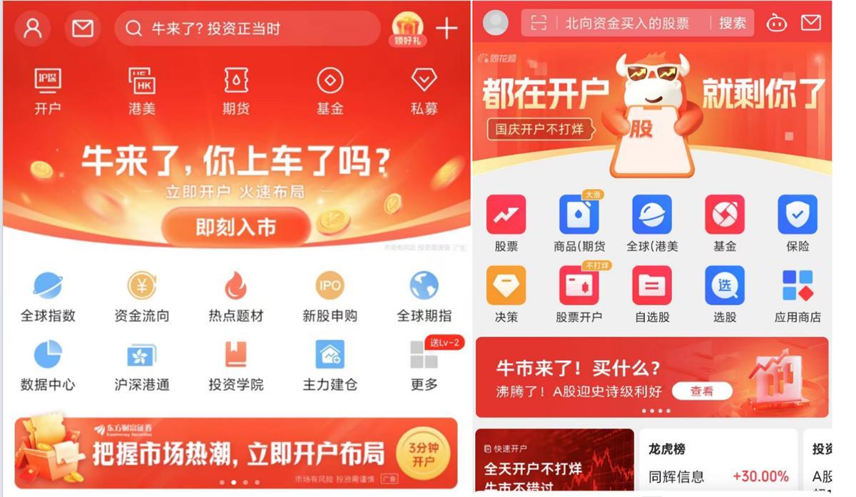 “牛来了,你上车了吗?”“牛市来了!买什么?”极目新闻记者注意到,目前,多款炒股软件在首页位置均推出醒目的与“牛市”相关推广,并称7×24小时免费开户。