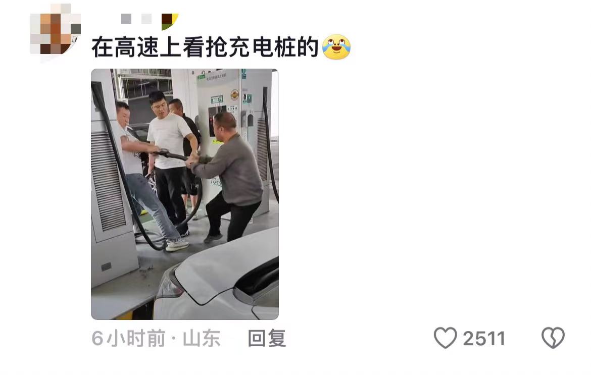 堵在路上有多难受?不仅要望车兴叹,还得抢充电桩。一位山东网友分享,高速路上有司机直接开始“拔河”,抢起了充电桩。