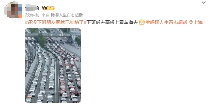 一位上海的网友拍下了30日下午的即时路况,马路上一眼望去全是车,下班不是回家度假,而是去高架上看“车海”。