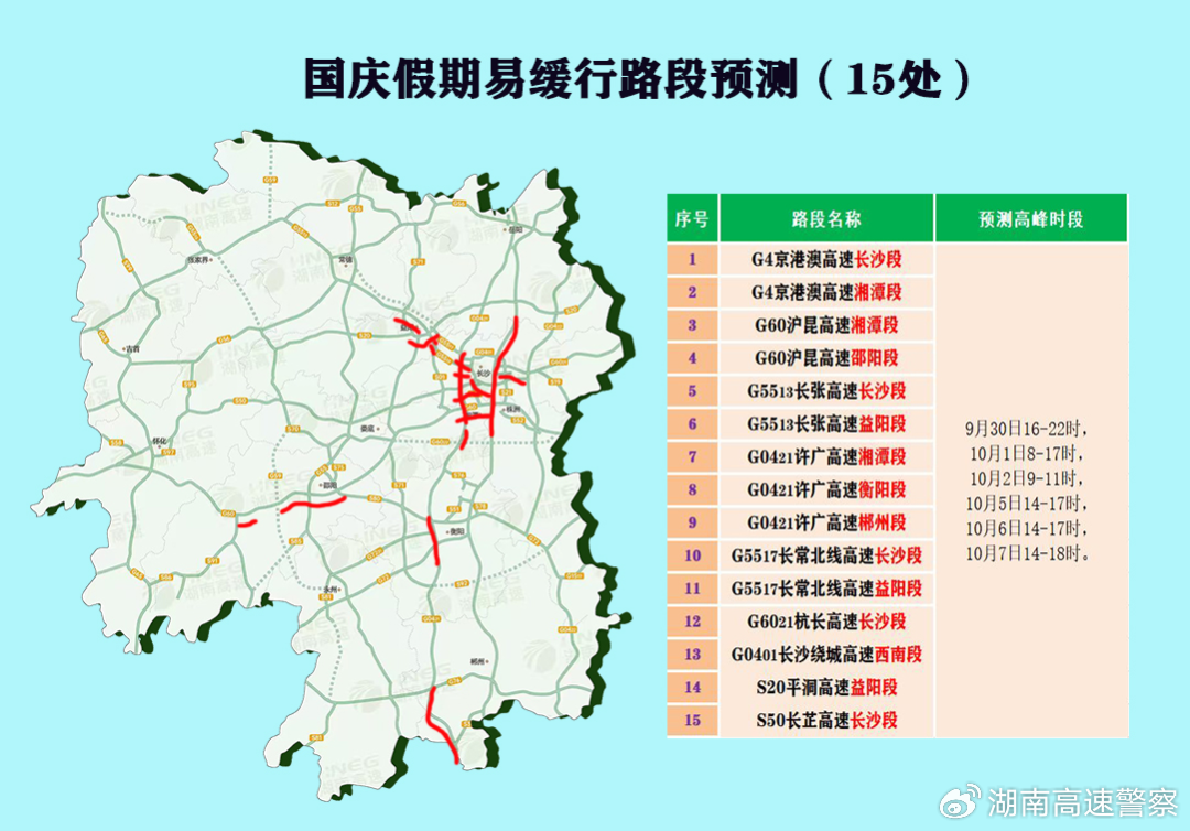 据湖南高速警察,9月30日14时开始,错峰出行车流逐步增多,特别是在14时至23时,处于收费期,高速公路呈现拥堵高峰状态,城市周边收费站出入口流量“井喷式”增长,易发生缓行和拥堵。部分收费站入口(长沙西、长沙、学士、雨花收费站)车流可能呈井喷态势,或有车辆间歇性排队现象。
