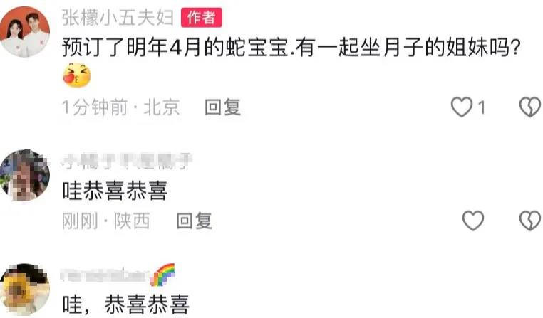 看到张檬怀孕,网友们都纷纷留言送上祝福。而张檬也亲自现身评论区与网友进行互动,张檬透露宝宝预产期是在明年四月,还在线邀请网友一起坐月子。