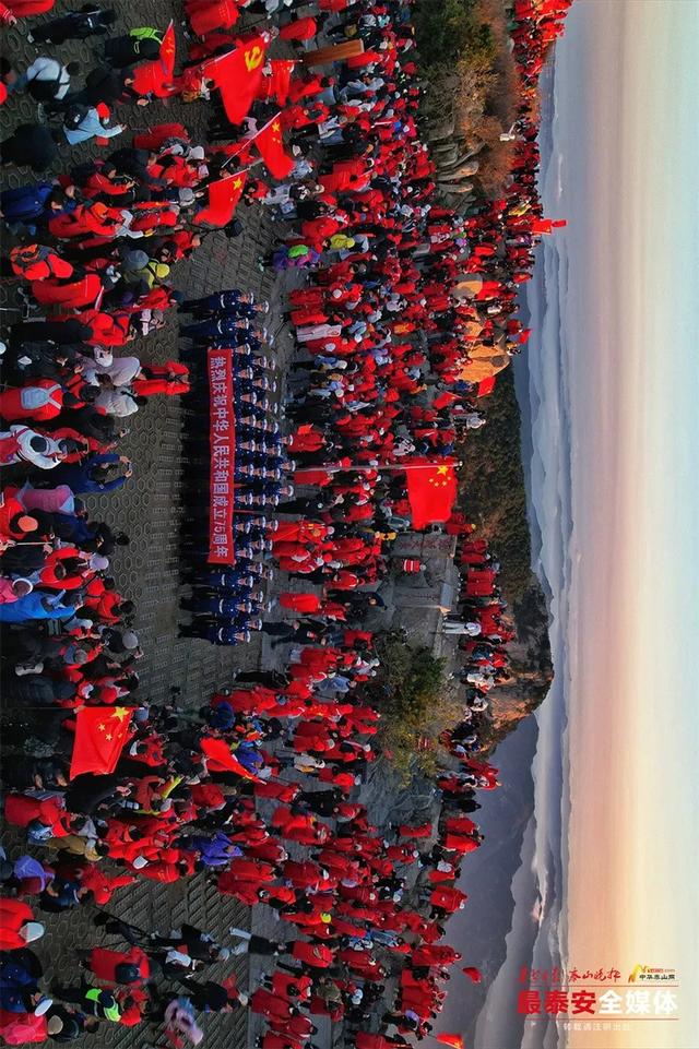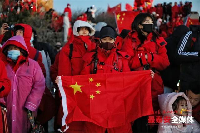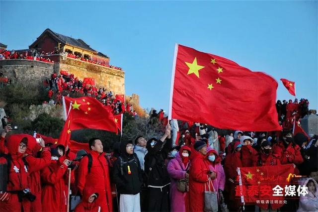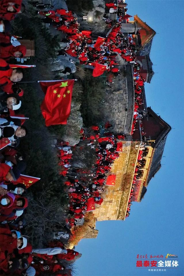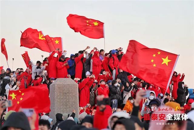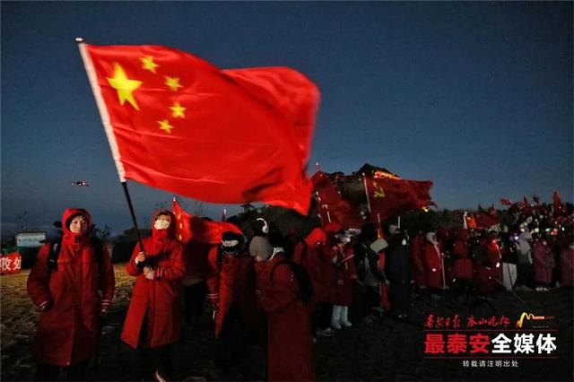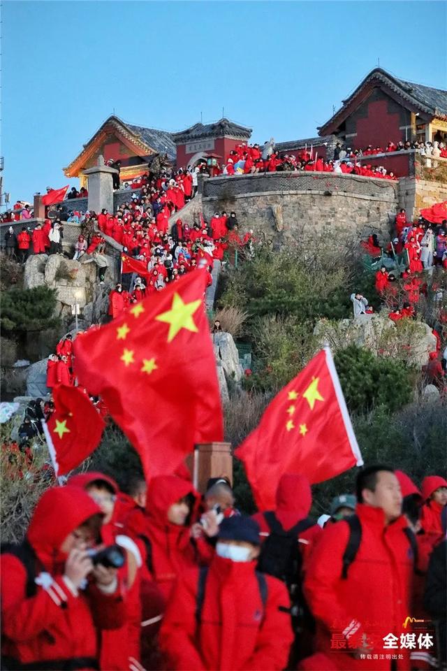 一面鲜艳的五星红旗在岱顶缓缓升起