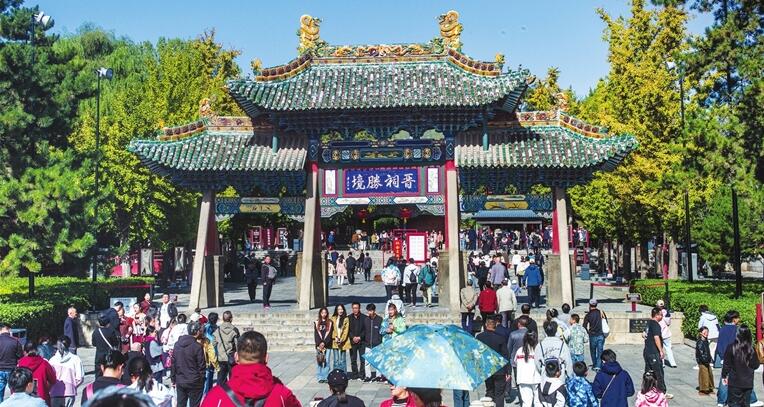10月2日,晋祠景区游人如织,处处洋溢喜庆红火的节日氛围。国庆长假期间,我市各大景区为广大市民和游客提供了安全舒适的出游环境。韩双喜摄