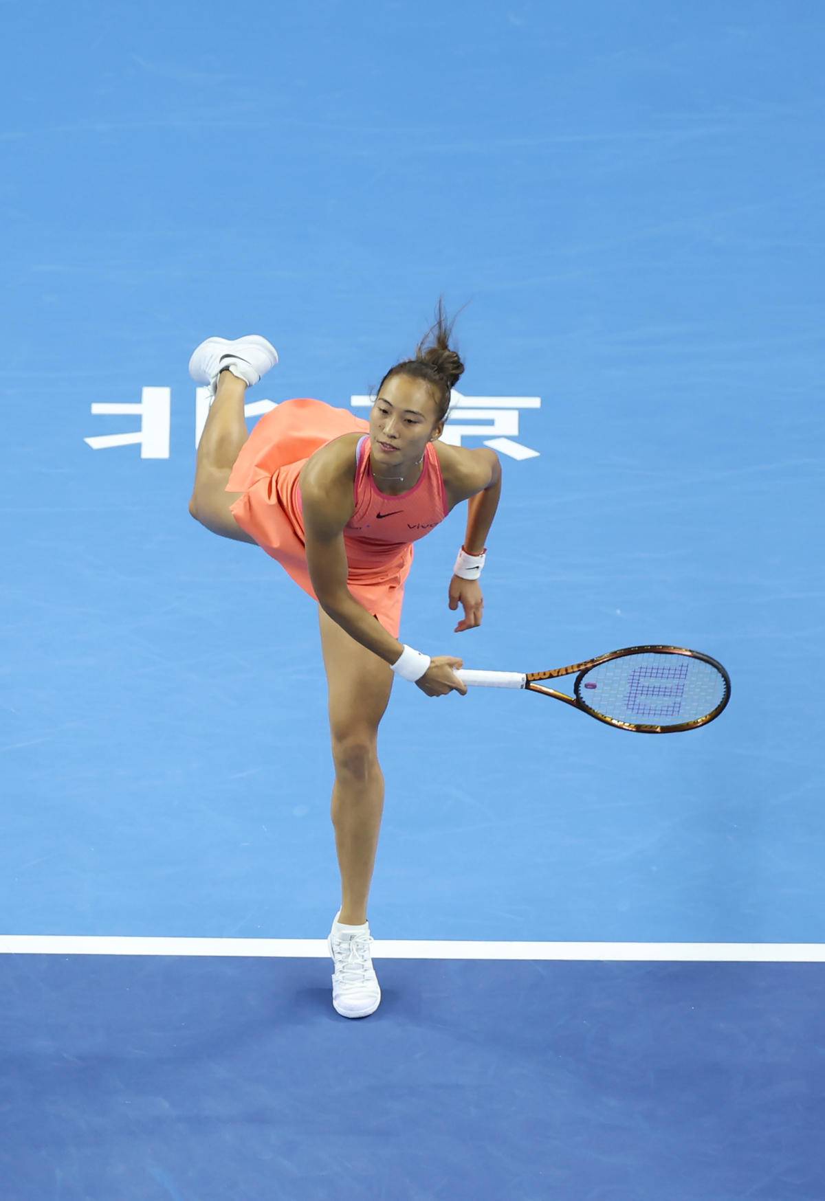 10月2日,郑钦文在比赛中发球(图源新华社)