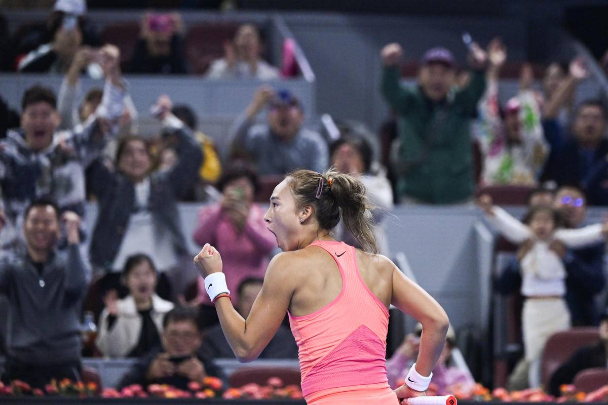 10月4日,郑钦文在赛后庆祝胜利(图源新华社)
