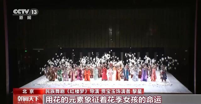 民族舞剧《红楼梦》导演 贾宝玉饰演者 黎星:舞剧中12钗的12个姑娘,她们有12朵相应的花。我们在表达姑娘命运在最美好繁盛的时间陨落的时候,我们用的也是烟花,用花的元素象征着花季女孩的命运,所以舞剧处处可以见到花。