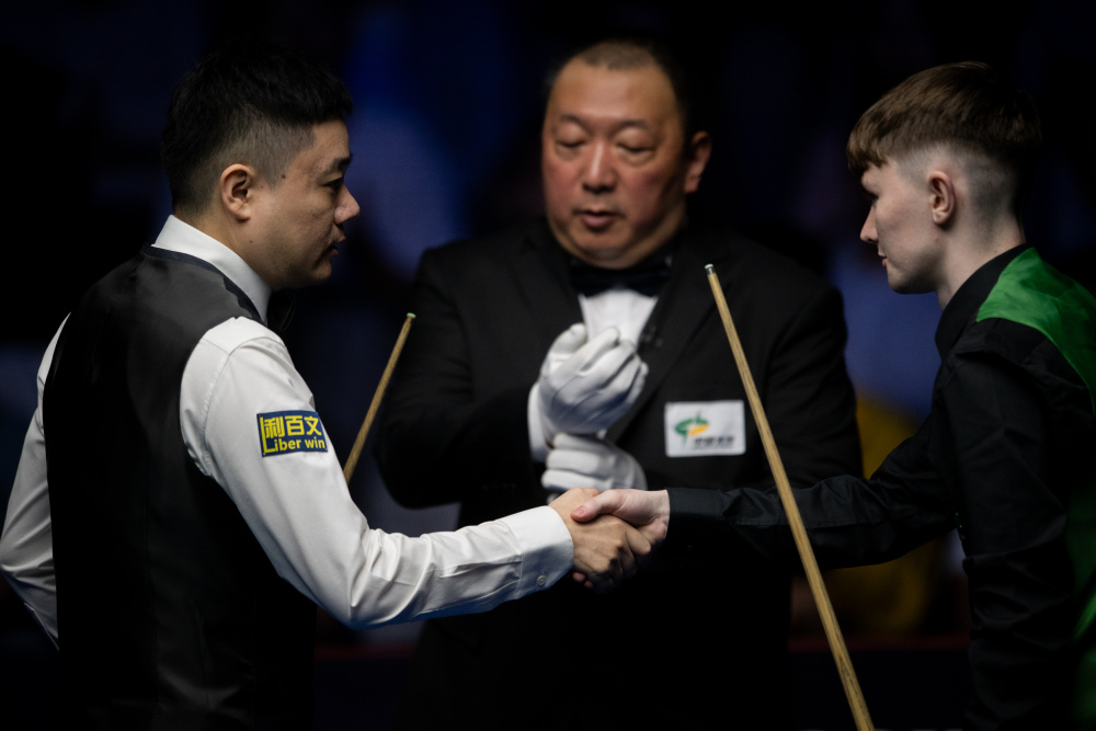 10月6日,丁俊晖(左)在比赛后与麦圭根握手。新华社记者 胡竞文 摄