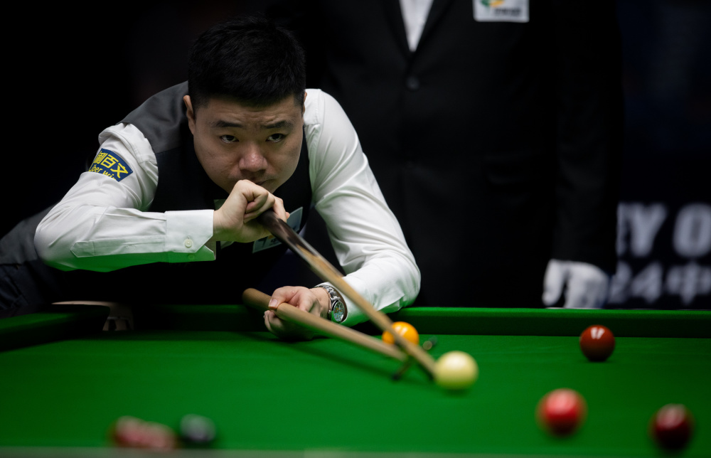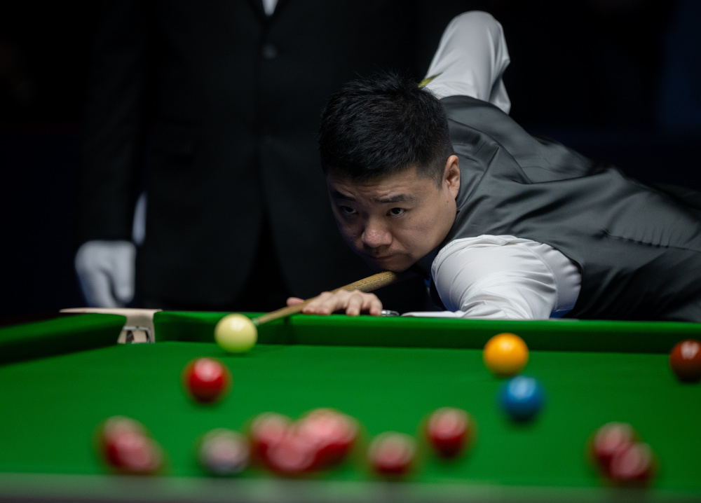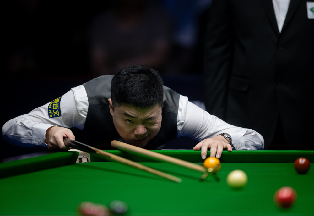 10月6日,丁俊晖在比赛中。新华社记者 胡竞文 摄
