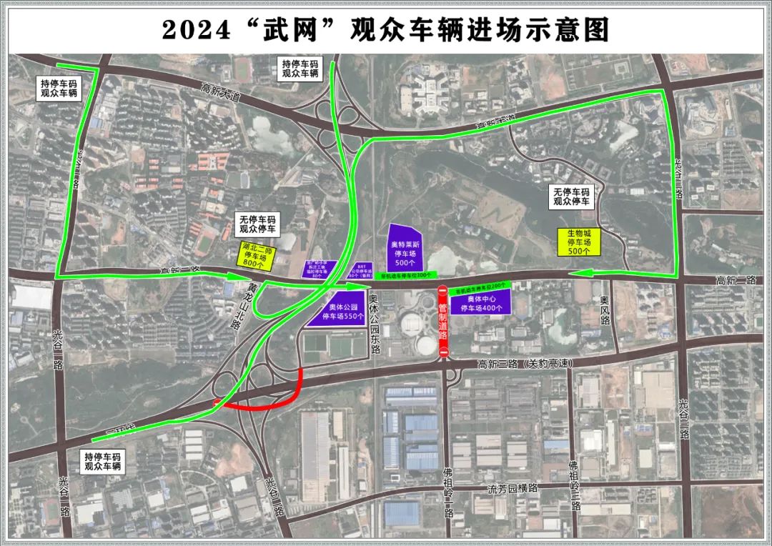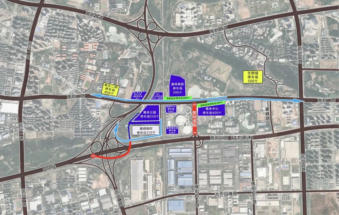 因赛事期间人、车流量较大,场馆周边停车泊位不足,为保障观众出行畅通,在高新二路(黄龙山北路至光谷三路)路段,实行停车管控,采取预约停车方式(一车一码)。