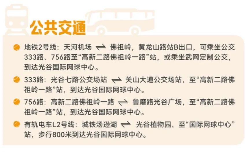 有预约停车码观众可选择光谷奥林匹克公园停车场(距网球中心0.4公里,每次10元)、武汉首创奥特莱斯停车场(0.2公里,5小时内免费,超过3元/小时)、湖北省奥体中心停车场(0.3公里,每次15元)、高新二路BRT公交车停车场(0.45公里,免费)、广岭小学拆迁工地(0.8公里,免费)。