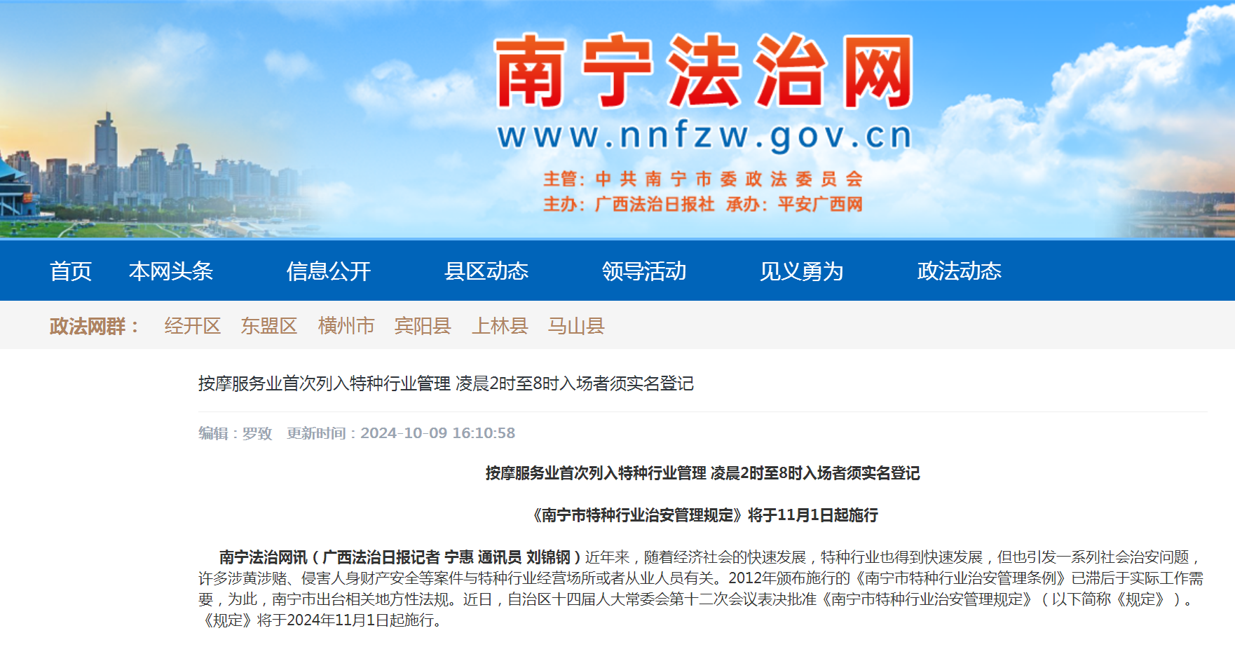 南宁法治网讯(广西法治日报记者 宁惠 通讯员 刘锦钢)近年来,随着经济社会的快速发展,特种行业也得到快速发展,但也引发一系列社会治安问题,许多涉黄涉赌、侵害人身财产安全等案件与特种行业经营场所或者从业人员有关。2012年颁布施行的《南宁市特种行业治安管理条例》已滞后于实际工作需要,为此,南宁市出台相关地方性法规。近日,自治区十四届人大常委会第十二次会议表决批准《南宁市特种行业治安管理规定》(以下简称《规定》)。《规定》将于2024年11月1日起施行。