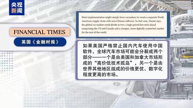 报道援引美国汽车咨询机构邓恩洞察公司首席执行官迈克尔·邓恩的话表示,如果美国严格禁止国内汽车使用中国软件,全球汽车市场可能会分裂成两个部分——一个是由美国和加拿大市场形成的“高价低技术孤岛”,另一个是由世界其他地区组成的价格更优、数字化程度更高的市场。