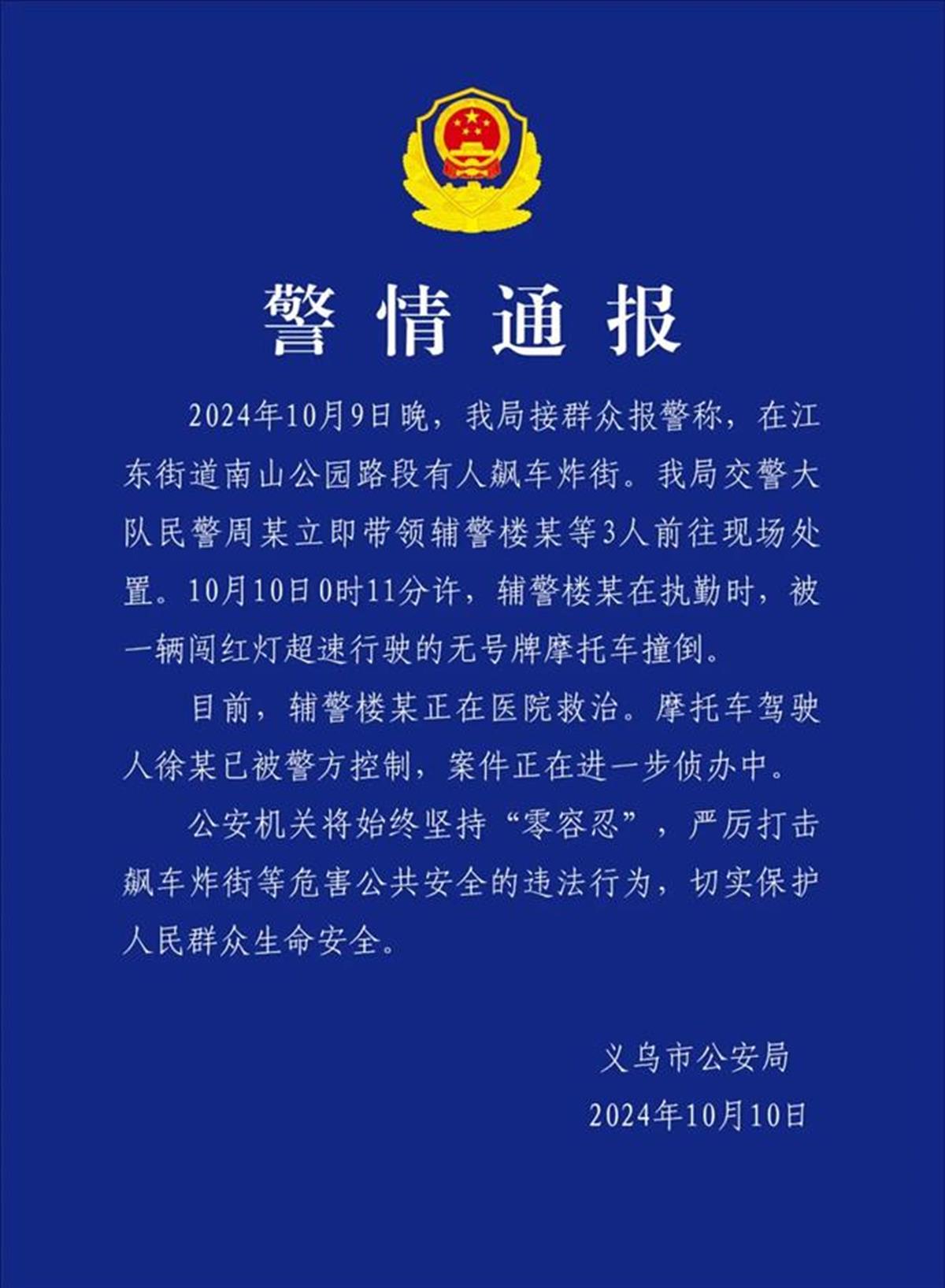 义乌市公安局发布警情通报称,10月9日晚,义乌市公安局接群众报警称,在江东街道南山公园路段有人飙车炸街。义乌市公安局交警大队民警周某立即带领辅警楼某等3人前往现场处置。10月10日0时11分许,辅警楼某在执勤时,被一辆闯红灯超速行驶的无号牌摩托车撞倒。目前,辅警楼某正在医院救治。摩托车驾驶人徐某已被警方控制,案件正在进一步侦办中。