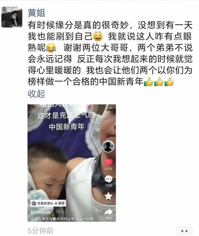 近日,石同学把当时在火车上拍的视频发到网上,并写道“过程很艰辛却让我们知道了年轻的意义和责任”。这则视频得到了20多万点赞,两人也被网友夸人帅心善。而黄女士也刷到了这则视频,并发朋友圈再次表达对石同学和魏同学的感谢,她说,“每次我想起来就觉得心里暖暖的,我也会让他们两个以你们为榜样,做一个合格的中国新青年。”