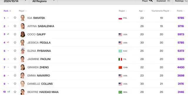 WTA积分排名。官网截图