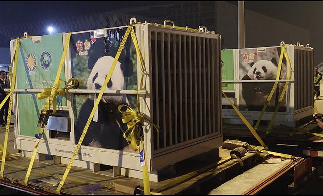 当地时间15日,大熊猫“宝力”和“青宝”搭乘专机抵达美国首都华盛顿附近的杜勒斯国际机场。
