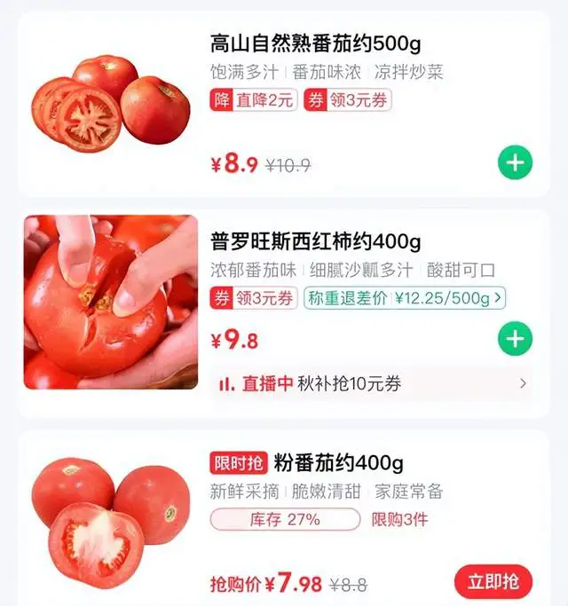 10月15日,经视直播记者在盒马、朴朴、美团等线上平台搜索西红柿发现,粉西红柿的价格平均8元/斤左右,而普罗旺斯西红柿的价格则在12元/斤左右。盒马鲜生武汉蔬菜采购负责人成弘向记者介绍,价格上涨主要还是因为供不应求,一方面是今年内蒙古、四川等国内西红柿主产区,种植规模减小,叠加高温、暴雨等天气,导致减产;另一方面,由于八九月份是西红柿的销售高峰,西红柿消费需求越来越大。成弘还告诉记者,随着山东等产区西红柿大量供应上市,进入10月中下旬,预计价格会迎来走低行情,“大概会回落至6元一斤”。