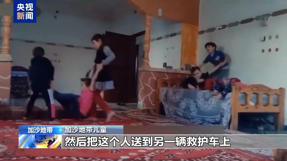加沙地带儿童一边玩游戏,一边喊着“把她送到救护车上”,“然后把这个人送到另一辆救护车上”。