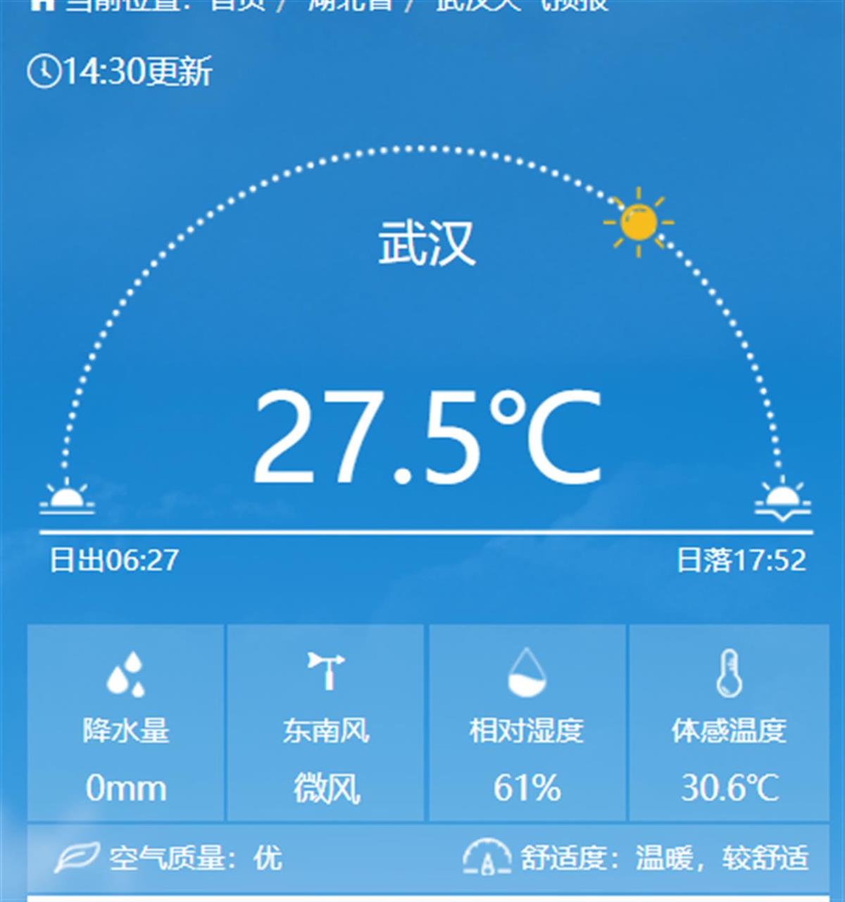 武汉14时30分,气温27.5℃,体感温度30.6℃