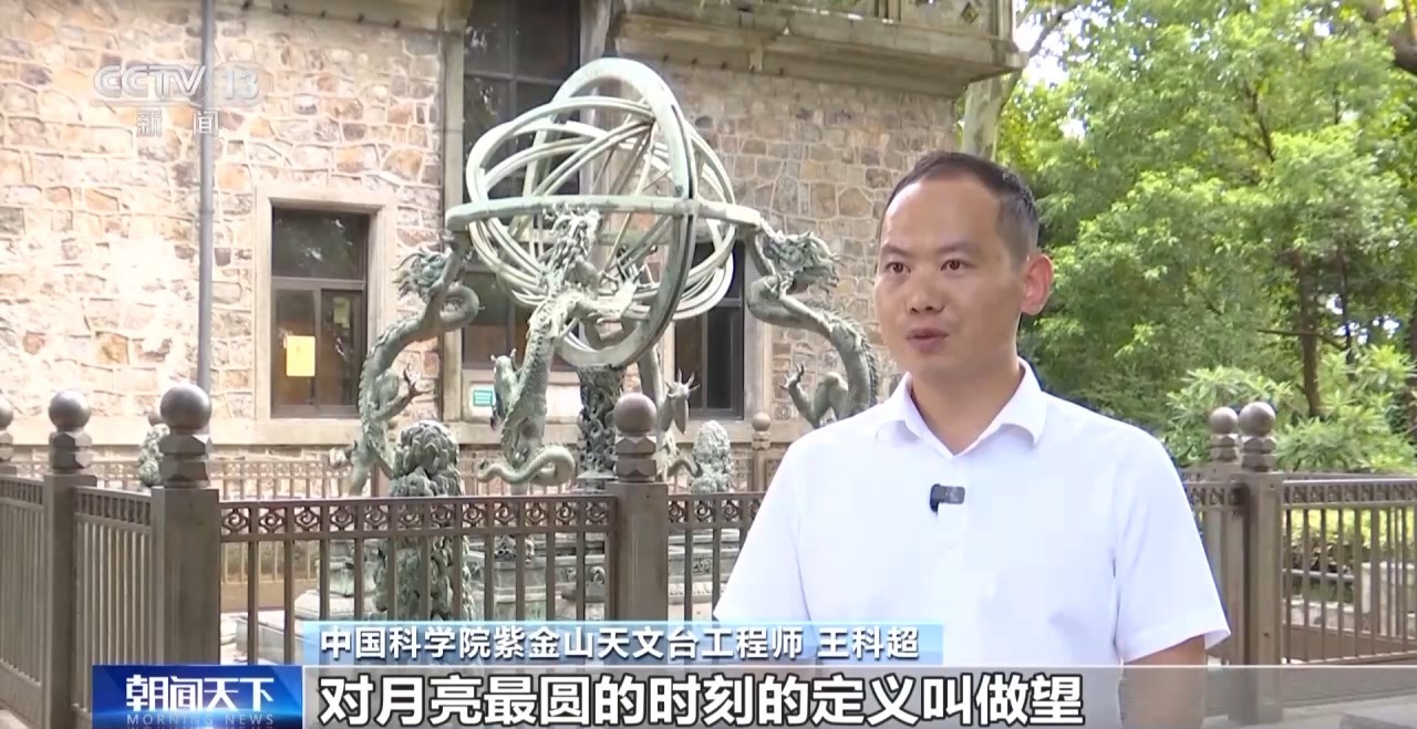 中国科学院紫金山天文台工程师 王科超:我们天文学当中对月亮最圆的时刻的定义叫作望。所谓的望是指月亮和太阳的地心视黄经相差180度,这时月亮、地球和太阳近乎一条直线的排列,这时我们看到的月亮最圆。