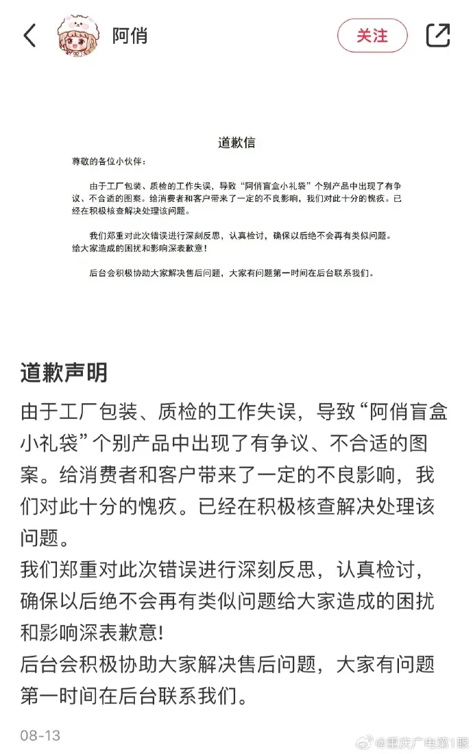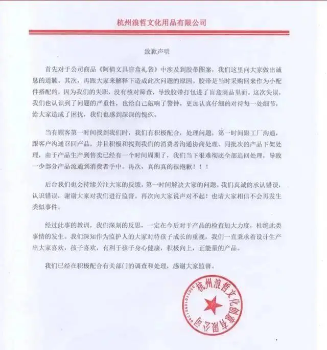 对于此次事件,公司表示十分抱歉,目前正在全力追回已售出的几十份包含不良图案的贴纸盲盒。公司还承诺,对于已购买的家长,会登记后重新发货合规产品,并且今后会对产品加强审核力度,积极配合有关部门进行调查和处理。
