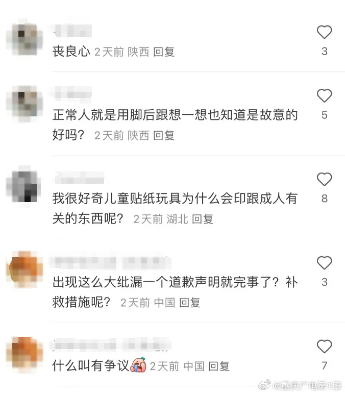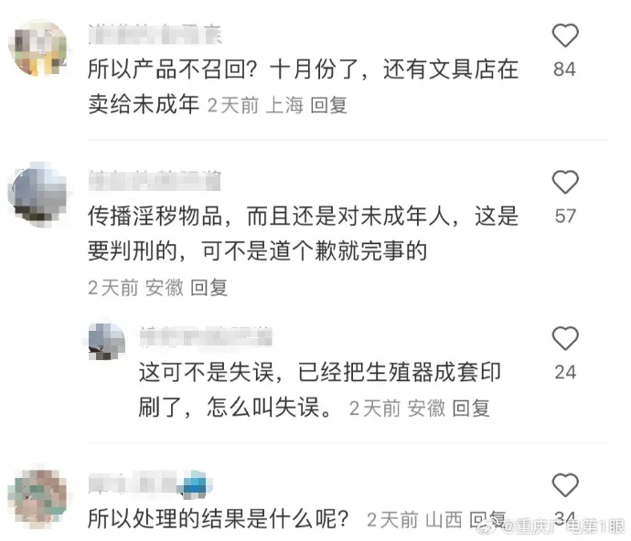 评论区的家长们纷纷对厂家发出质疑:公然在儿童文具、玩具上印制这样的淫秽图片,这已经不是所谓的给孩子普及性教育,而是严重的传播淫秽色情物品的行为,对未成年人的身心健康造成了极大的危害。