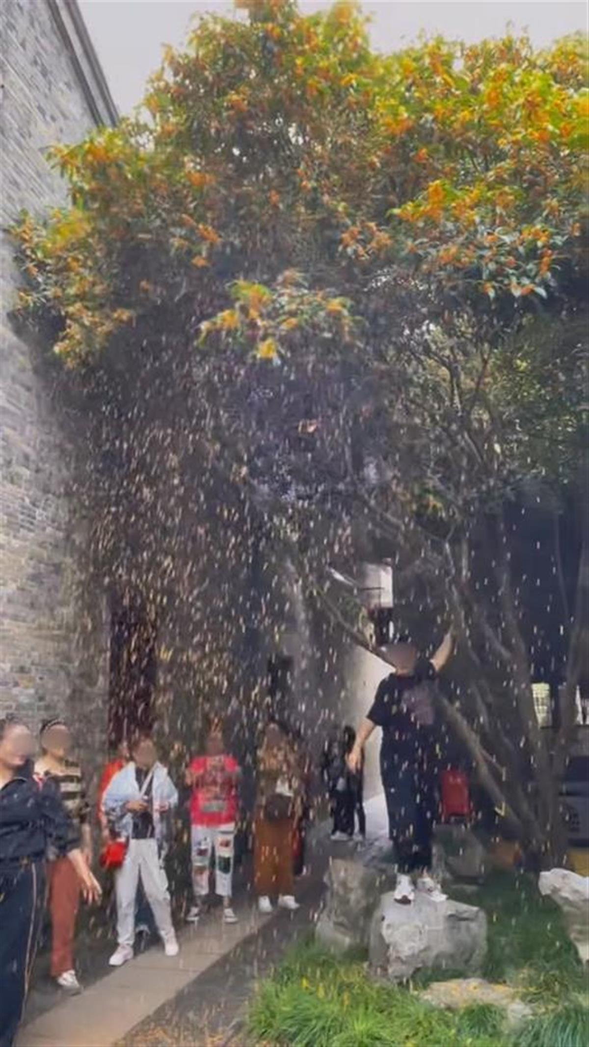 网友发布的视频中,一名女子踩在桂花树下的景观石上,抓住桂花树枝大力摇晃,大量桂花随之掉落,形成“桂花雨”,过程持续数秒。一旁有女子拿手机拍摄。