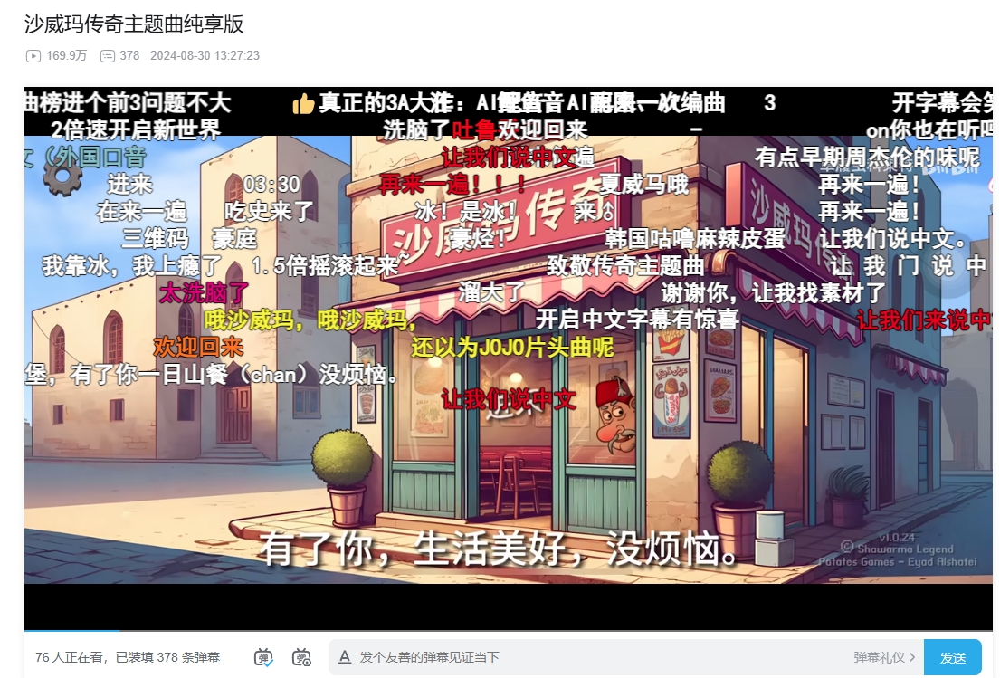 选择一个播放量最高的点开来看,“再来一遍”“洗脑”“全文背诵”等弹幕充斥整个屏幕。“哦,沙威玛,哦,沙威玛”的阵阵魔性歌词,其中类似“今晚没番茄,否则我会吼叫”的歌词却被一本正经地唱出来,属实绷不住。