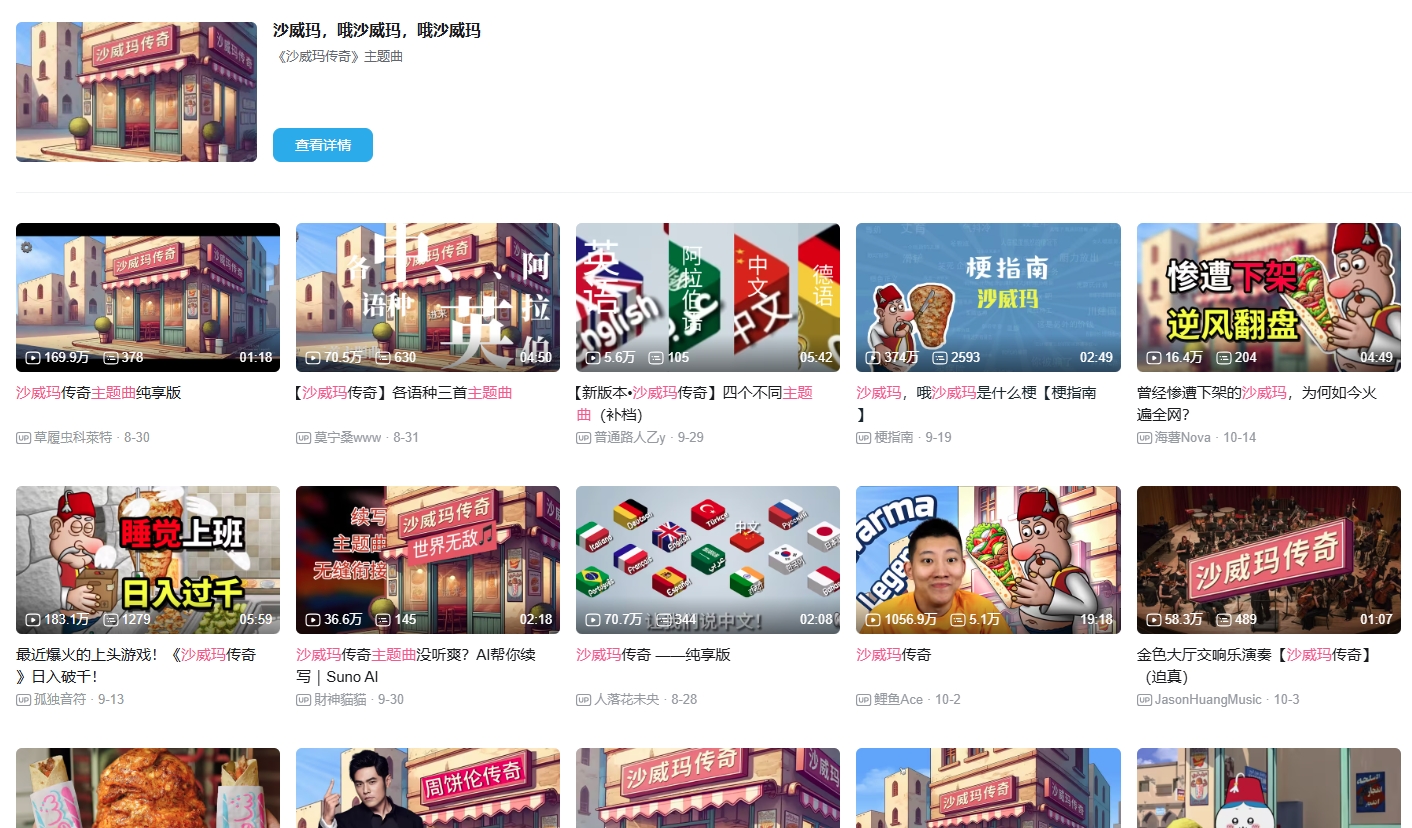 如果有幸没被沙威玛的BGM神曲洗脑,可能也会有些莫名其妙的梗搞得直挠头。在B站以“沙威玛主题曲”关键词进行搜索,能看到一水儿的二创视频,播放量都还不低。