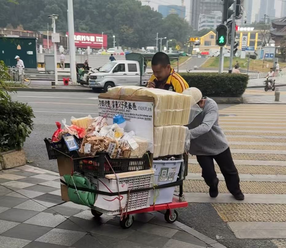 从出租屋出发,雷叔叔推着沉重的小推车,紧紧牵着孩子的手,沿着珞喻路一路经过卓刀泉中学、华师、武大,路上只要有人买东西就会停下来。一路上,推着车的雷叔叔常常因为看不清楚前方地面的路况导致小推车的轮子陷进了坑里。“车轮太小了,载重又大,掉进去了得花大力气才能推出来。”每当这个时候,雷叔叔先把孩子安置在一旁,然后再用力把车推出来,用右手牵上孩子,慢慢继续向前走。为了让孩子舒服一些,雷叔叔特意准备了两个折叠凳,在一个地方停留久了,他就会让孩子坐下来休息,自己招呼顾客。