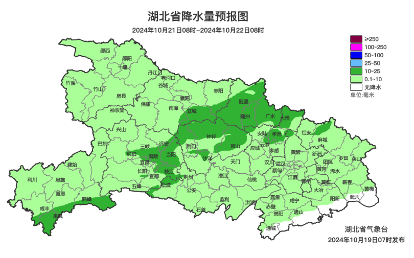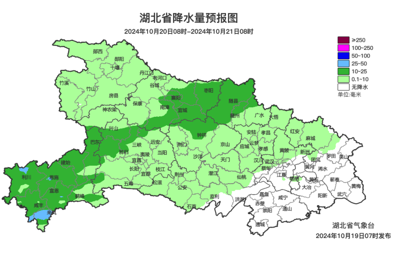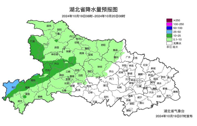 19日08时-20日08时,鄂西北、鄂西南、江汉平原北部阴天有小到中雨、局地大雨;其他地区多云到阴天。最高气温中西部16~19℃、东部20~23℃,最低气温鄂西北7~11℃、其他地区11~15℃,偏北风4到5级、阵风6到8级。