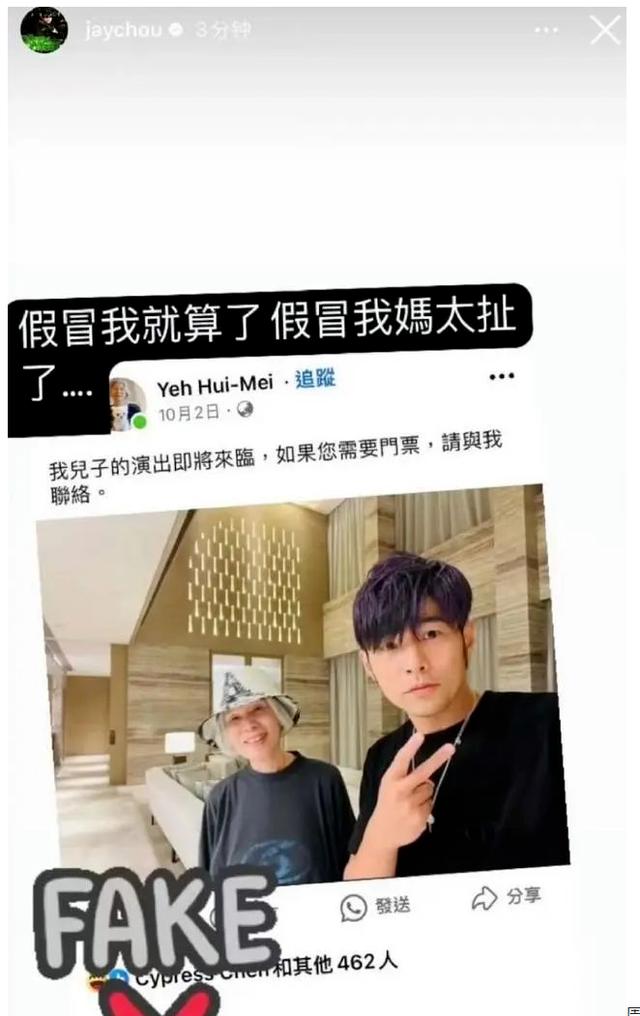 10月18日,明星周杰伦在个人社交平台上发帖,严厉谴责假冒其母亲叶惠美身份进行不法活动的行为。据悉,有不法分子利用叶惠美的名字开设脸书粉丝团,并发布虚假消息,声称可以购买周杰伦23号台北大巨蛋演唱会的黄牛票。