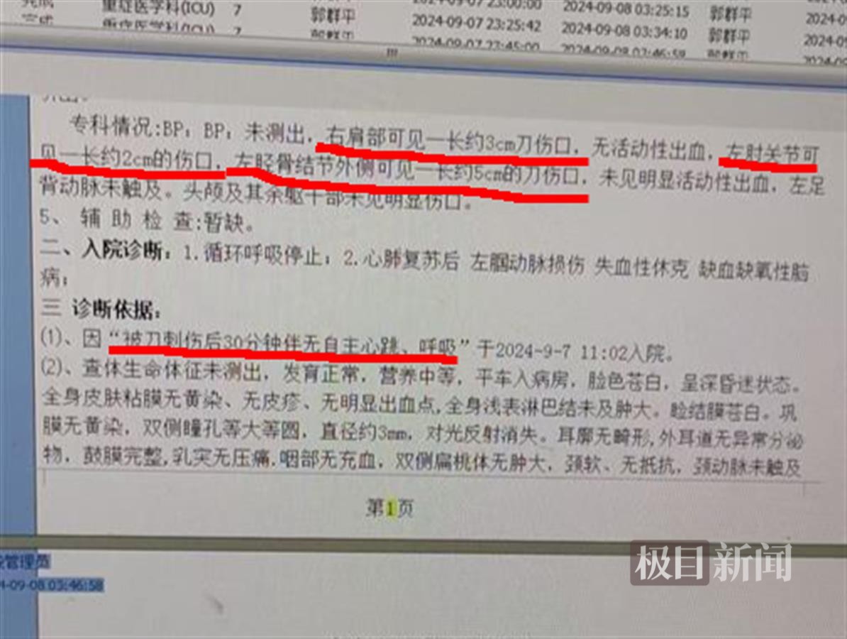 家属提供的病例照片显示,况海涓因被刀刺伤后30分钟伴无自主心跳、呼吸,于9月7日11时2分入院,右肩部有一条长约3厘米的刀伤口,左肘关节有一条长约2厘米的伤口,左胫骨结节外侧有一条长约5厘米的刀伤口,入院诊断为循环呼吸停止、心肺复苏后左腘动脉损伤、失血性休克、缺血缺氧性脑病。