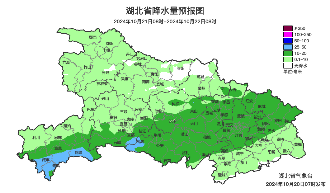 21日08时-22日08时,全省阴天有小到中雨,其中鄂西南、江汉平原南部局地大雨。最高气温中西部14~17℃、东部17~22℃,最低气温中西部8~13℃、东部13~16℃,偏北风2到3级、夜间转3到4级。