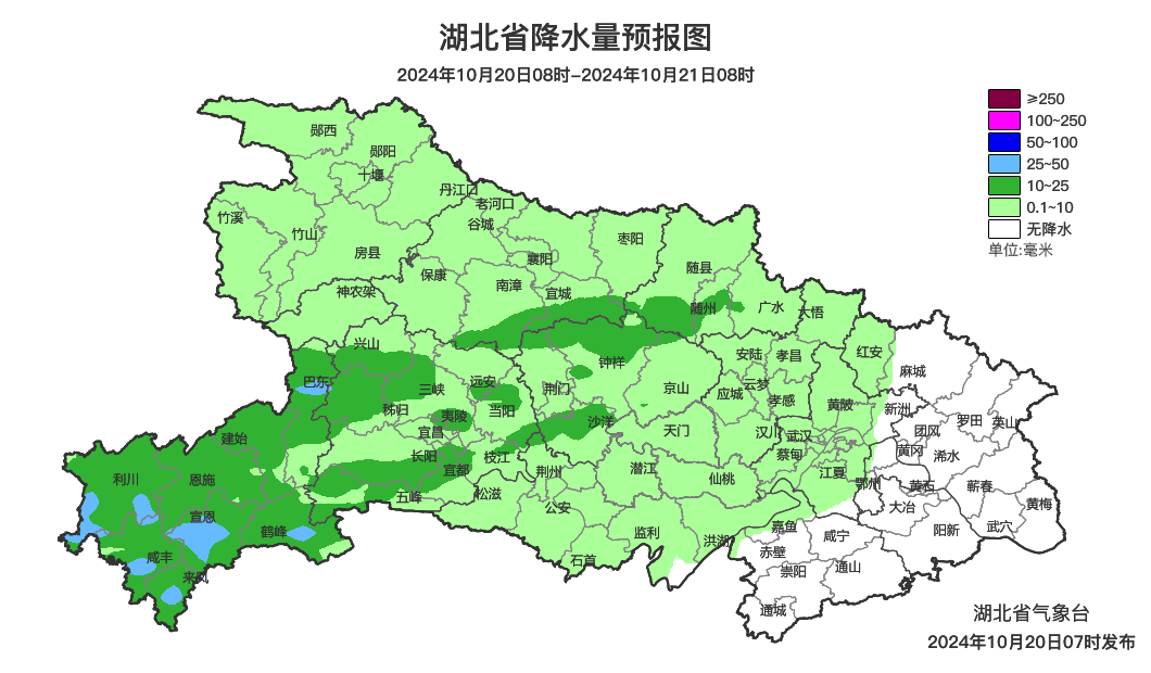 20日08时-21日08时,鄂西北、鄂西南、江汉平原北部阴天有小到中雨,局地大雨;鄂东南、鄂东北东部多云转阴天;其他地区阴天有小雨。最高气温鄂西北9~11℃、鄂东南17~21℃、其他地区12~16℃,最低气温鄂西北7~10℃、其他地区11~15℃,偏北风3到4级、阵风5到6级。